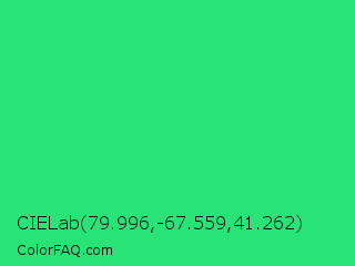 CIELab 79.996,-67.559,41.262 Color is a normal green color and the nearest color is UFO Green #3cd070. Hex code #28e375 and RGB value is rgb(40,227,117). In RGB color space, this color is composed of 16% red, 89% green, 46% blue, In CMYK color space, this color is composed of 82% cyan, 0% magenta, 48% yellow , 11% black , In HSL color space, this color has a hue angle of 145° , 77% saturation and 52% lightness.