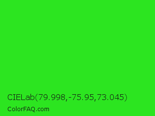 CIELab 79.998,-75.95,73.045 Color is a normal green color and the nearest color is Lime Green #32cd32. Hex code #2ce520 and RGB value is rgb(44,229,32). In RGB color space, this color is composed of 17% red, 90% green, 13% blue, In CMYK color space, this color is composed of 81% cyan, 0% magenta, 86% yellow , 10% black , In HSL color space, this color has a hue angle of 116° , 79% saturation and 51% lightness.