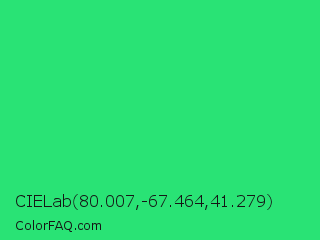 CIELab 80.007,-67.464,41.279 Color is a normal green color and the nearest color is UFO Green #3cd070. Hex code #29e375 and RGB value is rgb(41,227,117). In RGB color space, this color is composed of 16% red, 89% green, 46% blue, In CMYK color space, this color is composed of 82% cyan, 0% magenta, 48% yellow , 11% black , In HSL color space, this color has a hue angle of 145° , 77% saturation and 53% lightness.