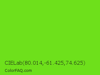 CIELab 80.014,-61.425,74.625 Color is a normal green color and the nearest color is Alien Armpit #84de02. Hex code #6ee01b and RGB value is rgb(110,224,27). In RGB color space, this color is composed of 43% red, 88% green, 11% blue, In CMYK color space, this color is composed of 51% cyan, 0% magenta, 88% yellow , 12% black , In HSL color space, this color has a hue angle of 95° , 78% saturation and 49% lightness.