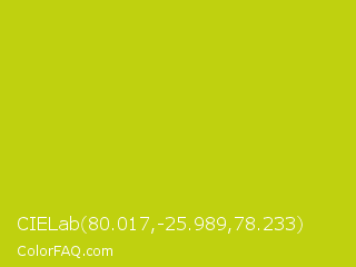CIELab 80.017,-25.989,78.233 Color is a normal yellow color and the nearest color is Rio Grande #bbd009. Hex code #bfd10f and RGB value is rgb(191,209,15). In RGB color space, this color is composed of 75% red, 82% green, 6% blue, In CMYK color space, this color is composed of 9% cyan, 0% magenta, 93% yellow , 18% black , In HSL color space, this color has a hue angle of 66° , 87% saturation and 44% lightness.