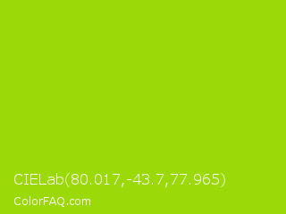 CIELab 80.017,-43.7,77.965 Color is a normal lime color and the nearest color is Vivid Lime Green #a6d608. Hex code #9cd908 and RGB value is rgb(156,217,8). In RGB color space, this color is composed of 61% red, 85% green, 3% blue, In CMYK color space, this color is composed of 28% cyan, 0% magenta, 96% yellow , 15% black , In HSL color space, this color has a hue angle of 78° , 93% saturation and 44% lightness.