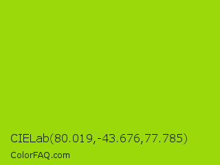 CIELab 80.019,-43.676,77.785 Color is a normal lime color and the nearest color is Vivid Lime Green #a6d608. Hex code #9cd90a and RGB value is rgb(156,217,10). In RGB color space, this color is composed of 61% red, 85% green, 4% blue, In CMYK color space, this color is composed of 28% cyan, 0% magenta, 95% yellow , 15% black , In HSL color space, this color has a hue angle of 78° , 91% saturation and 45% lightness.