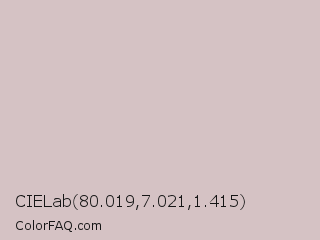 CIELab 80.019,7.021,1.415 Color is a light red color and the nearest color is Swirl #d3cdc5. Hex code #d5c2c4 and RGB value is rgb(213,194,196). In RGB color space, this color is composed of 84% red, 76% green, 77% blue, In CMYK color space, this color is composed of 0% cyan, 9% magenta, 8% yellow , 16% black , In HSL color space, this color has a hue angle of 354° , 18% saturation and 80% lightness.