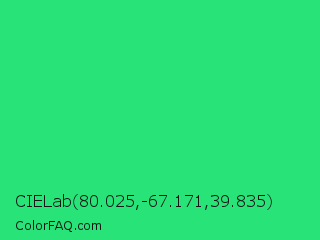 CIELab 80.025,-67.171,39.835 Color is a normal green color and the nearest color is UFO Green #3cd070. Hex code #27e378 and RGB value is rgb(39,227,120). In RGB color space, this color is composed of 15% red, 89% green, 47% blue, In CMYK color space, this color is composed of 83% cyan, 0% magenta, 47% yellow , 11% black , In HSL color space, this color has a hue angle of 146° , 77% saturation and 52% lightness.