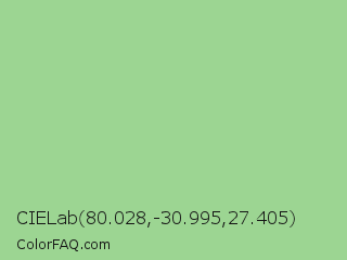 CIELab 80.028,-30.995,27.405 Color is a light green color and the nearest color is Feijoa #9fdd8c. Hex code #9cd592 and RGB value is rgb(156,213,146). In RGB color space, this color is composed of 61% red, 84% green, 57% blue, In CMYK color space, this color is composed of 27% cyan, 0% magenta, 31% yellow , 16% black , In HSL color space, this color has a hue angle of 111° , 44% saturation and 70% lightness.