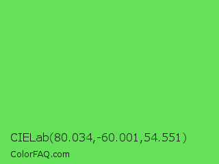 CIELab 80.034,-60.001,54.551 Color is a light green color and the nearest color is Screamin Green #66ff66. Hex code #64e059 and RGB value is rgb(100,224,89). In RGB color space, this color is composed of 39% red, 88% green, 35% blue, In CMYK color space, this color is composed of 55% cyan, 0% magenta, 60% yellow , 12% black , In HSL color space, this color has a hue angle of 115° , 69% saturation and 61% lightness.