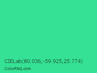 CIELab 80.036,-59.925,25.774 Color is a normal green color and the nearest color is Shamrock #33cc99. Hex code #35e194 and RGB value is rgb(53,225,148). In RGB color space, this color is composed of 21% red, 88% green, 58% blue, In CMYK color space, this color is composed of 76% cyan, 0% magenta, 34% yellow , 12% black , In HSL color space, this color has a hue angle of 153° , 74% saturation and 55% lightness.