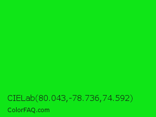 CIELab 80.043,-78.736,74.592 Color is a normal green color and the nearest color is Green #00ff00. Hex code #0fe617 and RGB value is rgb(15,230,23). In RGB color space, this color is composed of 6% red, 90% green, 9% blue, In CMYK color space, this color is composed of 93% cyan, 0% magenta, 90% yellow , 10% black , In HSL color space, this color has a hue angle of 122° , 88% saturation and 48% lightness.