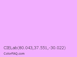 CIELab 80.043,37.551,-30.022 Color is a very light purple color and the nearest color is Rich Brilliant Lavender #f1a7fe. Hex code #f2afff and RGB value is rgb(242,175,255). In RGB color space, this color is composed of 95% red, 69% green, 100% blue, In CMYK color space, this color is composed of 5% cyan, 31% magenta, 0% yellow , 0% black , In HSL color space, this color has a hue angle of 290° , 100% saturation and 84% lightness.