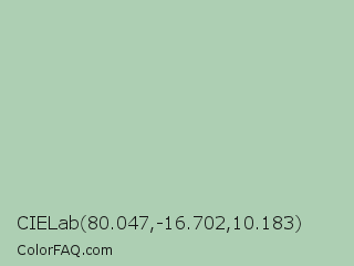 CIELab 80.047,-16.702,10.183 Color is a light green color and the nearest color is Spring Rain #accbb1. Hex code #adcfb3 and RGB value is rgb(173,207,179). In RGB color space, this color is composed of 68% red, 81% green, 70% blue, In CMYK color space, this color is composed of 16% cyan, 0% magenta, 14% yellow , 19% black , In HSL color space, this color has a hue angle of 131° , 26% saturation and 75% lightness.