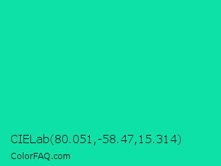 CIELab 80.051,-58.47,15.314 Color is a normal cyan color and the nearest color is Caribbean Green #00cc99. Hex code #0ee1a8 and RGB value is rgb(14,225,168). In RGB color space, this color is composed of 5% red, 88% green, 66% blue, In CMYK color space, this color is composed of 94% cyan, 0% magenta, 25% yellow , 12% black , In HSL color space, this color has a hue angle of 164° , 88% saturation and 47% lightness.