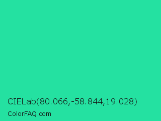 CIELab 80.066,-58.844,19.028 Color is a normal green color and the nearest color is Shamrock #33cc99. Hex code #24e1a1 and RGB value is rgb(36,225,161). In RGB color space, this color is composed of 14% red, 88% green, 63% blue, In CMYK color space, this color is composed of 84% cyan, 0% magenta, 28% yellow , 12% black , In HSL color space, this color has a hue angle of 160° , 76% saturation and 51% lightness.