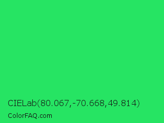 CIELab 80.067,-70.668,49.814 Color is a normal green color and the nearest color is UFO Green #3cd070. Hex code #26e463 and RGB value is rgb(38,228,99). In RGB color space, this color is composed of 15% red, 89% green, 39% blue, In CMYK color space, this color is composed of 83% cyan, 0% magenta, 57% yellow , 11% black , In HSL color space, this color has a hue angle of 139° , 78% saturation and 52% lightness.