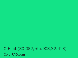 CIELab 80.082,-65.908,32.413 Color is a normal green color and the nearest color is Spring Green #00ff7f. Hex code #13e387 and RGB value is rgb(19,227,135). In RGB color space, this color is composed of 7% red, 89% green, 53% blue, In CMYK color space, this color is composed of 92% cyan, 0% magenta, 41% yellow , 11% black , In HSL color space, this color has a hue angle of 153° , 85% saturation and 48% lightness.
