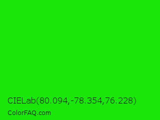 CIELab 80.094,-78.354,76.228 Color is a normal green color and the nearest color is Green #00ff00. Hex code #1be60a and RGB value is rgb(27,230,10). In RGB color space, this color is composed of 11% red, 90% green, 4% blue, In CMYK color space, this color is composed of 88% cyan, 0% magenta, 96% yellow , 10% black , In HSL color space, this color has a hue angle of 115° , 92% saturation and 47% lightness.