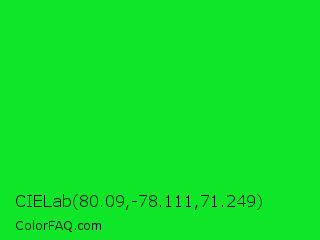 CIELab 80.09,-78.111,71.249 Color is a normal green color and the nearest color is Vivid Malachite #00cc33. Hex code #0ee628 and RGB value is rgb(14,230,40). In RGB color space, this color is composed of 5% red, 90% green, 16% blue, In CMYK color space, this color is composed of 94% cyan, 0% magenta, 83% yellow , 10% black , In HSL color space, this color has a hue angle of 127° , 89% saturation and 48% lightness.