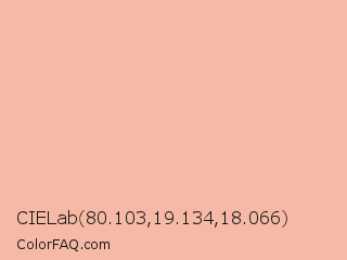 CIELab 80.103,19.134,18.066 Color is a very light red color and the nearest color is Rose Bud #fbb2a3. Hex code #f5b9a6 and RGB value is rgb(245,185,166). In RGB color space, this color is composed of 96% red, 73% green, 65% blue, In CMYK color space, this color is composed of 0% cyan, 24% magenta, 32% yellow , 4% black , In HSL color space, this color has a hue angle of 14° , 80% saturation and 81% lightness.