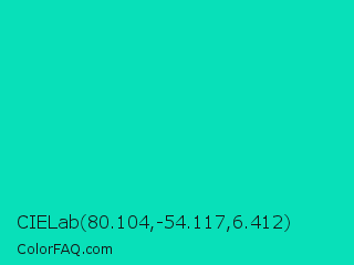 CIELab 80.104,-54.117,6.412 Color is a normal cyan color and the nearest color is Robins Egg Blue #00cccc. Hex code #08e0b9 and RGB value is rgb(8,224,185). In RGB color space, this color is composed of 3% red, 88% green, 73% blue, In CMYK color space, this color is composed of 96% cyan, 0% magenta, 17% yellow , 12% black , In HSL color space, this color has a hue angle of 169° , 93% saturation and 45% lightness.