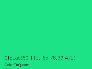 CIELab 80.111,-65.78,33.471 Color is a normal green color and the nearest color is Shamrock #33cc99. Hex code #1ce385 and RGB value is rgb(28,227,133). In RGB color space, this color is composed of 11% red, 89% green, 52% blue, In CMYK color space, this color is composed of 88% cyan, 0% magenta, 41% yellow , 11% black , In HSL color space, this color has a hue angle of 152° , 78% saturation and 50% lightness.