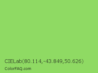 CIELab 80.114,-43.849,50.626 Color is a light green color and the nearest color is Pistachio #93c572. Hex code #8fda63 and RGB value is rgb(143,218,99). In RGB color space, this color is composed of 56% red, 85% green, 39% blue, In CMYK color space, this color is composed of 34% cyan, 0% magenta, 55% yellow , 15% black , In HSL color space, this color has a hue angle of 98° , 62% saturation and 62% lightness.