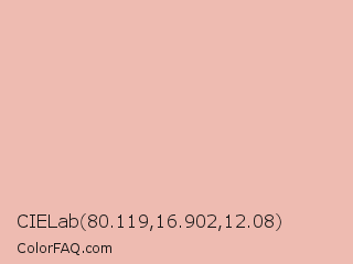 CIELab 80.119,16.902,12.08 Color is a very light red color and the nearest color is Shilo #e8b9b3. Hex code #eebbb1 and RGB value is rgb(238,187,177). In RGB color space, this color is composed of 93% red, 73% green, 69% blue, In CMYK color space, this color is composed of 0% cyan, 21% magenta, 26% yellow , 7% black , In HSL color space, this color has a hue angle of 10° , 64% saturation and 81% lightness.