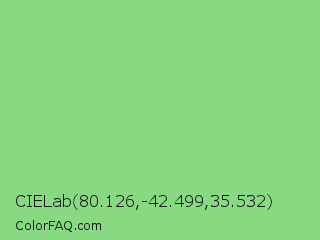 CIELab 80.126,-42.499,35.532 Color is a light green color and the nearest color is Pastel Green #77dd77. Hex code #87da82 and RGB value is rgb(135,218,130). In RGB color space, this color is composed of 53% red, 85% green, 51% blue, In CMYK color space, this color is composed of 38% cyan, 0% magenta, 40% yellow , 15% black , In HSL color space, this color has a hue angle of 117° , 54% saturation and 68% lightness.