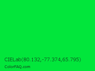 CIELab 80.132,-77.374,65.795 Color is a normal green color and the nearest color is Malachite #0bda51. Hex code #01e63b and RGB value is rgb(1,230,59). In RGB color space, this color is composed of 0% red, 90% green, 23% blue, In CMYK color space, this color is composed of 100% cyan, 0% magenta, 74% yellow , 10% black , In HSL color space, this color has a hue angle of 135° , 99% saturation and 45% lightness.