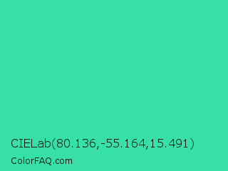 CIELab 80.136,-55.164,15.491 Color is a normal green color and the nearest color is Eucalyptus #44d7a8. Hex code #36e0a8 and RGB value is rgb(54,224,168). In RGB color space, this color is composed of 21% red, 88% green, 66% blue, In CMYK color space, this color is composed of 76% cyan, 0% magenta, 25% yellow , 12% black , In HSL color space, this color has a hue angle of 160° , 73% saturation and 55% lightness.