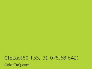 CIELab 80.155,-31.078,68.642 Color is a normal lime color and the nearest color is Android Green #a4c639. Hex code #b3d438 and RGB value is rgb(179,212,56). In RGB color space, this color is composed of 70% red, 83% green, 22% blue, In CMYK color space, this color is composed of 16% cyan, 0% magenta, 74% yellow , 17% black , In HSL color space, this color has a hue angle of 73° , 64% saturation and 53% lightness.