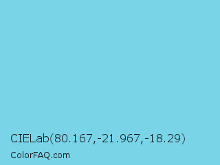 CIELab 80.167,-21.967,-18.29 Color is a light cyan color and the nearest color is Sky Blue #76d7ea. Hex code #79d4e8 and RGB value is rgb(121,212,232). In RGB color space, this color is composed of 47% red, 83% green, 91% blue, In CMYK color space, this color is composed of 48% cyan, 9% magenta, 0% yellow , 9% black , In HSL color space, this color has a hue angle of 191° , 71% saturation and 69% lightness.