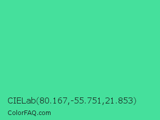 CIELab 80.167,-55.751,21.853 Color is a normal green color and the nearest color is Eucalyptus #44d7a8. Hex code #45e09c and RGB value is rgb(69,224,156). In RGB color space, this color is composed of 27% red, 88% green, 61% blue, In CMYK color space, this color is composed of 69% cyan, 0% magenta, 30% yellow , 12% black , In HSL color space, this color has a hue angle of 154° , 71% saturation and 57% lightness.