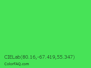 CIELab 80.16,-67.419,55.347 Color is a normal green color and the nearest color is UFO Green #3cd070. Hex code #47e357 and RGB value is rgb(71,227,87). In RGB color space, this color is composed of 28% red, 89% green, 34% blue, In CMYK color space, this color is composed of 69% cyan, 0% magenta, 62% yellow , 11% black , In HSL color space, this color has a hue angle of 126° , 74% saturation and 58% lightness.