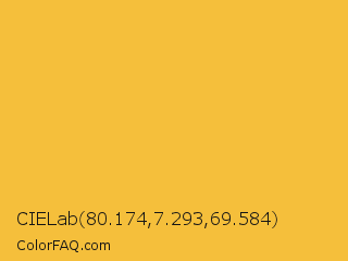 CIELab 80.174,7.293,69.584 Color is a normal orange color and the nearest color is Saffron #f4c430. Hex code #f5bf3b and RGB value is rgb(245,191,59). In RGB color space, this color is composed of 96% red, 75% green, 23% blue, In CMYK color space, this color is composed of 0% cyan, 22% magenta, 76% yellow , 4% black , In HSL color space, this color has a hue angle of 43° , 90% saturation and 60% lightness.