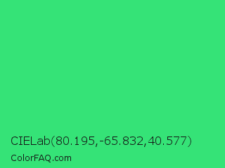 CIELab 80.195,-65.832,40.577 Color is a normal green color and the nearest color is UFO Green #3cd070. Hex code #35e377 and RGB value is rgb(53,227,119). In RGB color space, this color is composed of 21% red, 89% green, 47% blue, In CMYK color space, this color is composed of 77% cyan, 0% magenta, 48% yellow , 11% black , In HSL color space, this color has a hue angle of 143° , 76% saturation and 55% lightness.