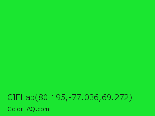 CIELab 80.195,-77.036,69.272 Color is a normal green color and the nearest color is Lime Green #32cd32. Hex code #1ae630 and RGB value is rgb(26,230,48). In RGB color space, this color is composed of 10% red, 90% green, 19% blue, In CMYK color space, this color is composed of 89% cyan, 0% magenta, 79% yellow , 10% black , In HSL color space, this color has a hue angle of 126° , 80% saturation and 50% lightness.