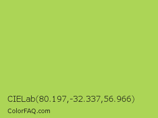 CIELab 80.197,-32.337,56.966 Color is a normal lime color and the nearest color is Conifer #acdd4d. Hex code #acd556 and RGB value is rgb(172,213,86). In RGB color space, this color is composed of 67% red, 84% green, 34% blue, In CMYK color space, this color is composed of 19% cyan, 0% magenta, 60% yellow , 16% black , In HSL color space, this color has a hue angle of 79° , 60% saturation and 59% lightness.