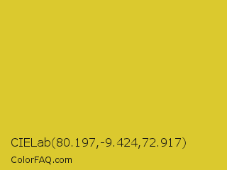 CIELab 80.197,-9.424,72.917 Color is a normal yellow color and the nearest color is Sunflower #e4d422. Hex code #dbc92e and RGB value is rgb(219,201,46). In RGB color space, this color is composed of 86% red, 79% green, 18% blue, In CMYK color space, this color is composed of 0% cyan, 8% magenta, 79% yellow , 14% black , In HSL color space, this color has a hue angle of 54° , 71% saturation and 52% lightness.