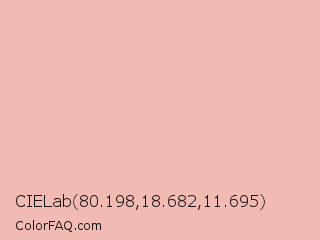 CIELab 80.198,18.682,11.695 Color is a very light red color and the nearest color is Mandys Pink #f2c3b2. Hex code #f1bab2 and RGB value is rgb(241,186,178). In RGB color space, this color is composed of 95% red, 73% green, 70% blue, In CMYK color space, this color is composed of 0% cyan, 23% magenta, 26% yellow , 5% black , In HSL color space, this color has a hue angle of 8° , 69% saturation and 82% lightness.