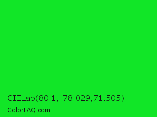 CIELab 80.1,-78.029,71.505 Color is a normal green color and the nearest color is Vivid Malachite #00cc33. Hex code #11e627 and RGB value is rgb(17,230,39). In RGB color space, this color is composed of 7% red, 90% green, 15% blue, In CMYK color space, this color is composed of 93% cyan, 0% magenta, 83% yellow , 10% black , In HSL color space, this color has a hue angle of 126° , 86% saturation and 48% lightness.
