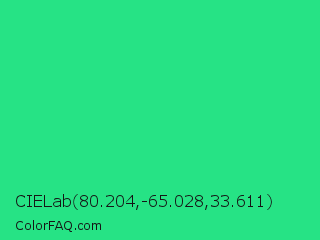 CIELab 80.204,-65.028,33.611 Color is a normal green color and the nearest color is Shamrock #33cc99. Hex code #26e385 and RGB value is rgb(38,227,133). In RGB color space, this color is composed of 15% red, 89% green, 52% blue, In CMYK color space, this color is composed of 83% cyan, 0% magenta, 41% yellow , 11% black , In HSL color space, this color has a hue angle of 150° , 77% saturation and 52% lightness.