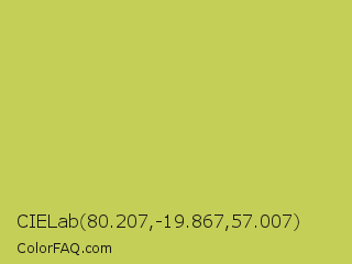 CIELab 80.207,-19.867,57.007 Color is a normal yellow color and the nearest color is June Bud #bdda57. Hex code #c4cf57 and RGB value is rgb(196,207,87). In RGB color space, this color is composed of 77% red, 81% green, 34% blue, In CMYK color space, this color is composed of 5% cyan, 0% magenta, 58% yellow , 19% black , In HSL color space, this color has a hue angle of 66° , 56% saturation and 58% lightness.