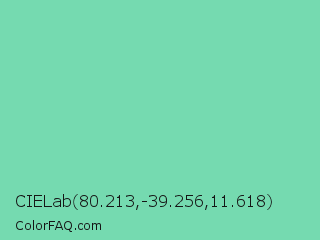 CIELab 80.213,-39.256,11.618 Color is a light green color and the nearest color is Medium Aquamarine #66ddaa. Hex code #75dab0 and RGB value is rgb(117,218,176). In RGB color space, this color is composed of 46% red, 85% green, 69% blue, In CMYK color space, this color is composed of 46% cyan, 0% magenta, 19% yellow , 15% black , In HSL color space, this color has a hue angle of 155° , 58% saturation and 66% lightness.