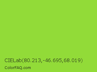 CIELab 80.213,-46.695,68.019 Color is a normal green color and the nearest color is Kiwi #8ee53f. Hex code #92db38 and RGB value is rgb(146,219,56). In RGB color space, this color is composed of 57% red, 86% green, 22% blue, In CMYK color space, this color is composed of 33% cyan, 0% magenta, 74% yellow , 14% black , In HSL color space, this color has a hue angle of 87° , 69% saturation and 54% lightness.