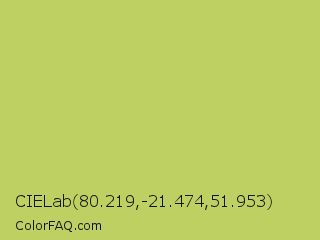 CIELab 80.219,-21.474,51.953 Color is a normal yellow color and the nearest color is June Bud #bdda57. Hex code #bfd062 and RGB value is rgb(191,208,98). In RGB color space, this color is composed of 75% red, 82% green, 38% blue, In CMYK color space, this color is composed of 8% cyan, 0% magenta, 53% yellow , 18% black , In HSL color space, this color has a hue angle of 69° , 54% saturation and 60% lightness.