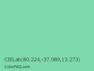 CIELab 80.224,-37.089,13.273 Color is a light green color and the nearest color is Vista Blue #8fd6b4. Hex code #7ed9ad and RGB value is rgb(126,217,173). In RGB color space, this color is composed of 49% red, 85% green, 68% blue, In CMYK color space, this color is composed of 42% cyan, 0% magenta, 20% yellow , 15% black , In HSL color space, this color has a hue angle of 151° , 54% saturation and 67% lightness.