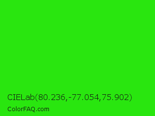CIELab 80.236,-77.054,75.902 Color is a normal green color and the nearest color is Neon Green #39ff14. Hex code #29e60f and RGB value is rgb(41,230,15). In RGB color space, this color is composed of 16% red, 90% green, 6% blue, In CMYK color space, this color is composed of 82% cyan, 0% magenta, 93% yellow , 10% black , In HSL color space, this color has a hue angle of 113° , 88% saturation and 48% lightness.