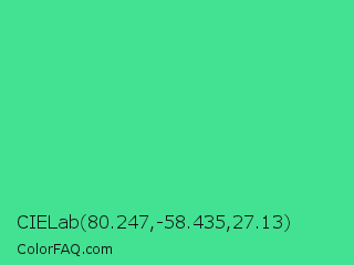 CIELab 80.247,-58.435,27.13 Color is a normal green color and the nearest color is Eucalyptus #44d7a8. Hex code #43e192 and RGB value is rgb(67,225,146). In RGB color space, this color is composed of 26% red, 88% green, 57% blue, In CMYK color space, this color is composed of 70% cyan, 0% magenta, 35% yellow , 12% black , In HSL color space, this color has a hue angle of 150° , 72% saturation and 57% lightness.