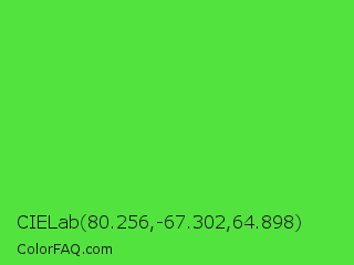 CIELab 80.256,-67.302,64.898 Color is a normal green color and the nearest color is Lime Green #32cd32. Hex code #53e33f and RGB value is rgb(83,227,63). In RGB color space, this color is composed of 33% red, 89% green, 25% blue, In CMYK color space, this color is composed of 63% cyan, 0% magenta, 72% yellow , 11% black , In HSL color space, this color has a hue angle of 113° , 75% saturation and 57% lightness.