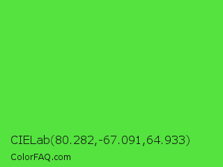 CIELab 80.282,-67.091,64.933 Color is a normal green color and the nearest color is Lime Green #32cd32. Hex code #54e33f and RGB value is rgb(84,227,63). In RGB color space, this color is composed of 33% red, 89% green, 25% blue, In CMYK color space, this color is composed of 63% cyan, 0% magenta, 72% yellow , 11% black , In HSL color space, this color has a hue angle of 112° , 75% saturation and 57% lightness.